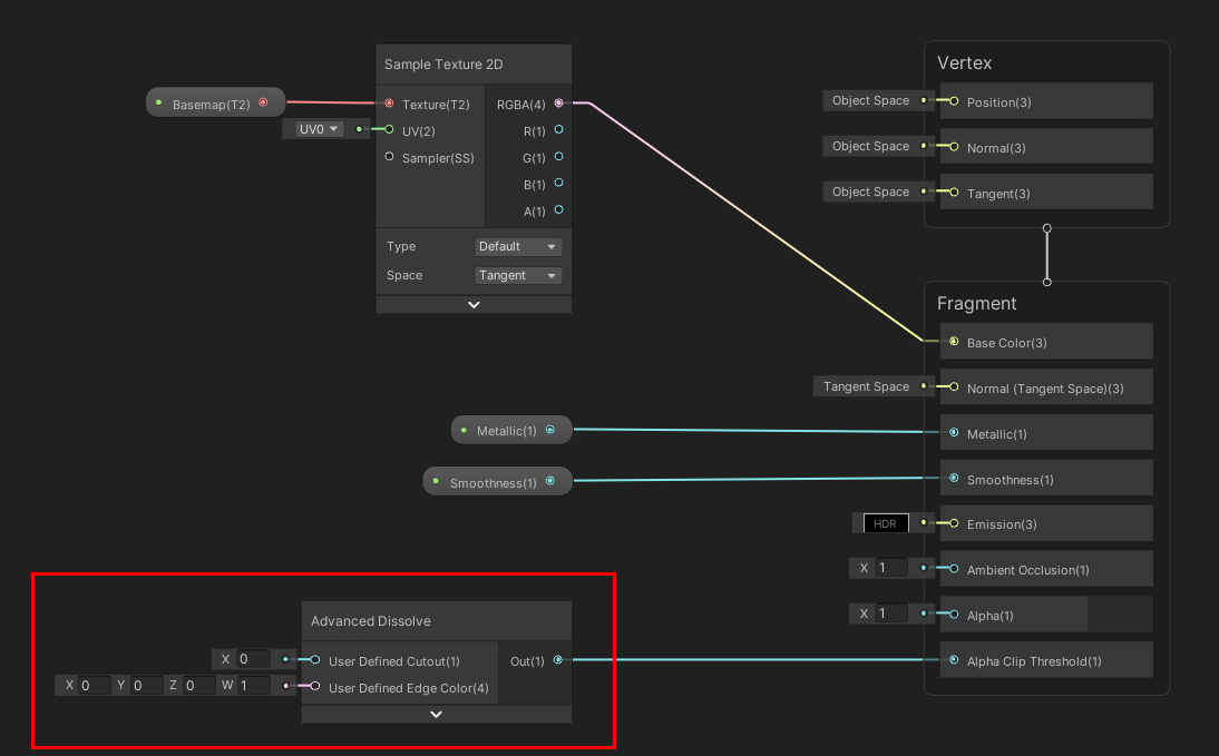 Advanced Dissolve node itself does nothing here. Its output value is always 0. This node serves as a "*marker"* for the HLSL shader generator.