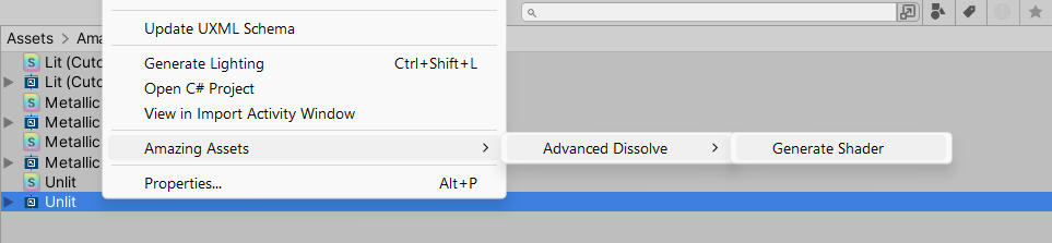 4. Now select ***.shadergraph*** file inside Project window and from the context menu choose <mark style="color:blue;">**Amazing Assets**</mark> <mark style="color:blue;"></mark><mark style="color:blue;">-></mark> <mark style="color:blue;"></mark><mark style="color:blue;">**Advanced Dissolve**</mark> <mark style="color:blue;"></mark><mark style="color:blue;">-></mark> <mark style="color:blue;"></mark><mark style="color:blue;">**Generate Shader**</mark><mark style="color:blue;">:</mark>