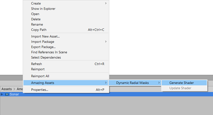 Select **Shader Graph** file containing DRM nodes inside **Project** window and from the context menu choose <mark style="color:blue;">**Amazing Assets → Dynamic Radial Masks → Generate Shader**</mark>. This creates a new shader file that is an exact copy of the selected **Shader Graph** file, but converted into HLSL format with all DRM properties and used variables baked inside it. Use this shader instead of **Shader Graph** file.